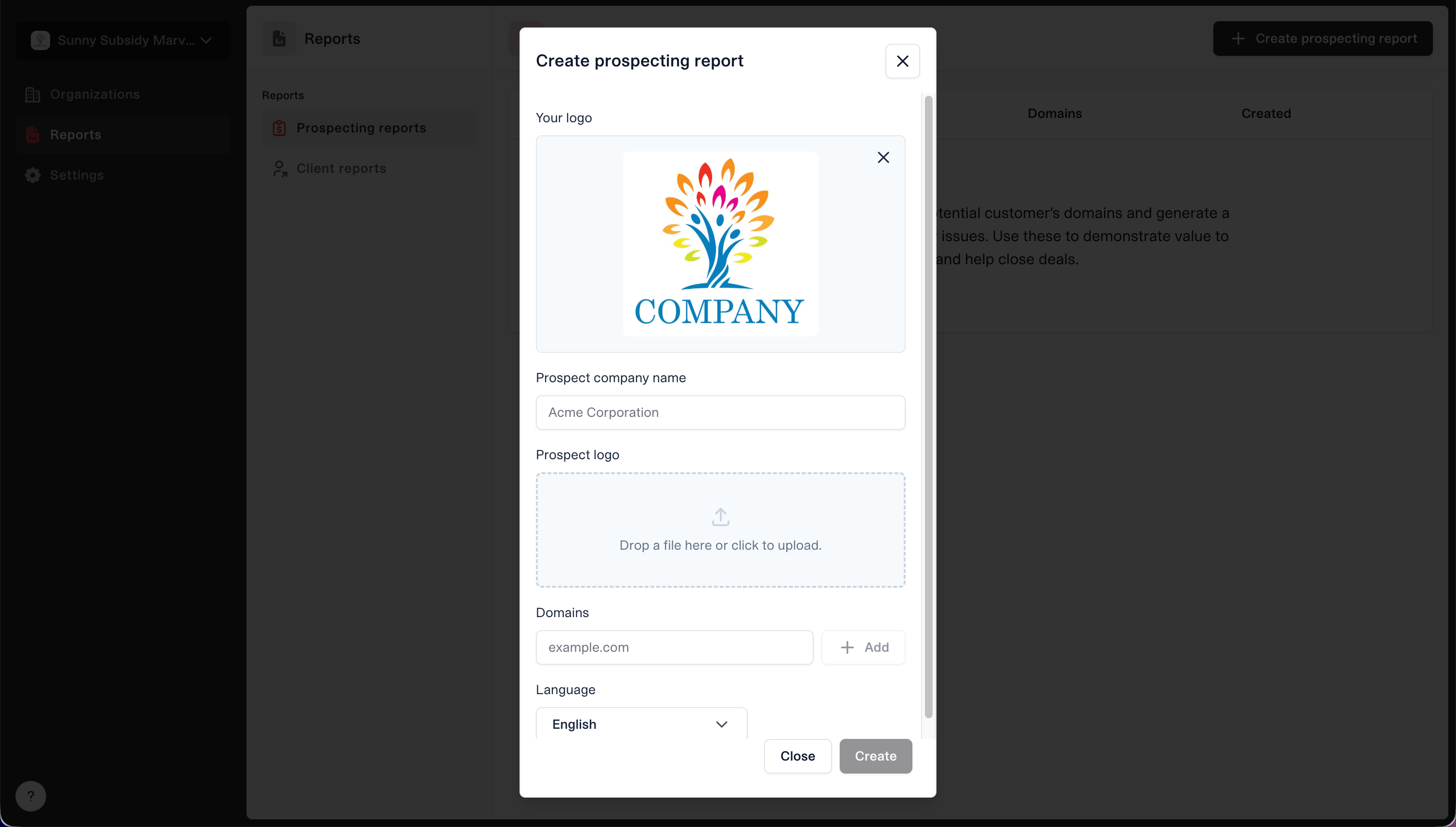 Prospecting reports let you generate a PDF that evaluates a prospect's email security posture. They're used by MSPs and consultants to demonstrate the value of DMARC monitoring during the sales process.