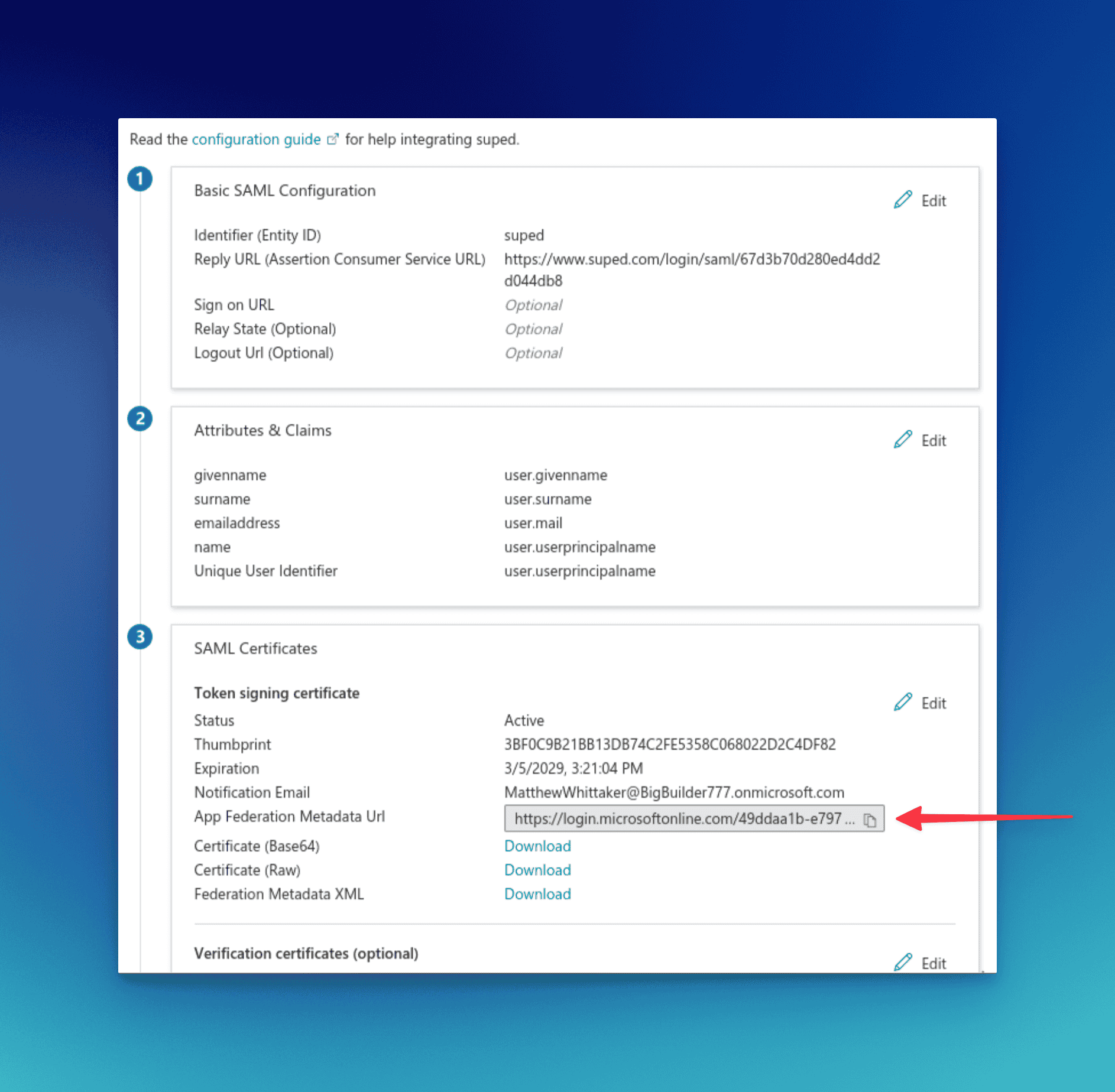 In the Azure portal, open Enterprise Applications, select your Suped application, then go to Single sign-on. Under SAML Certificates, copy the value of App Federation Metadata Url.