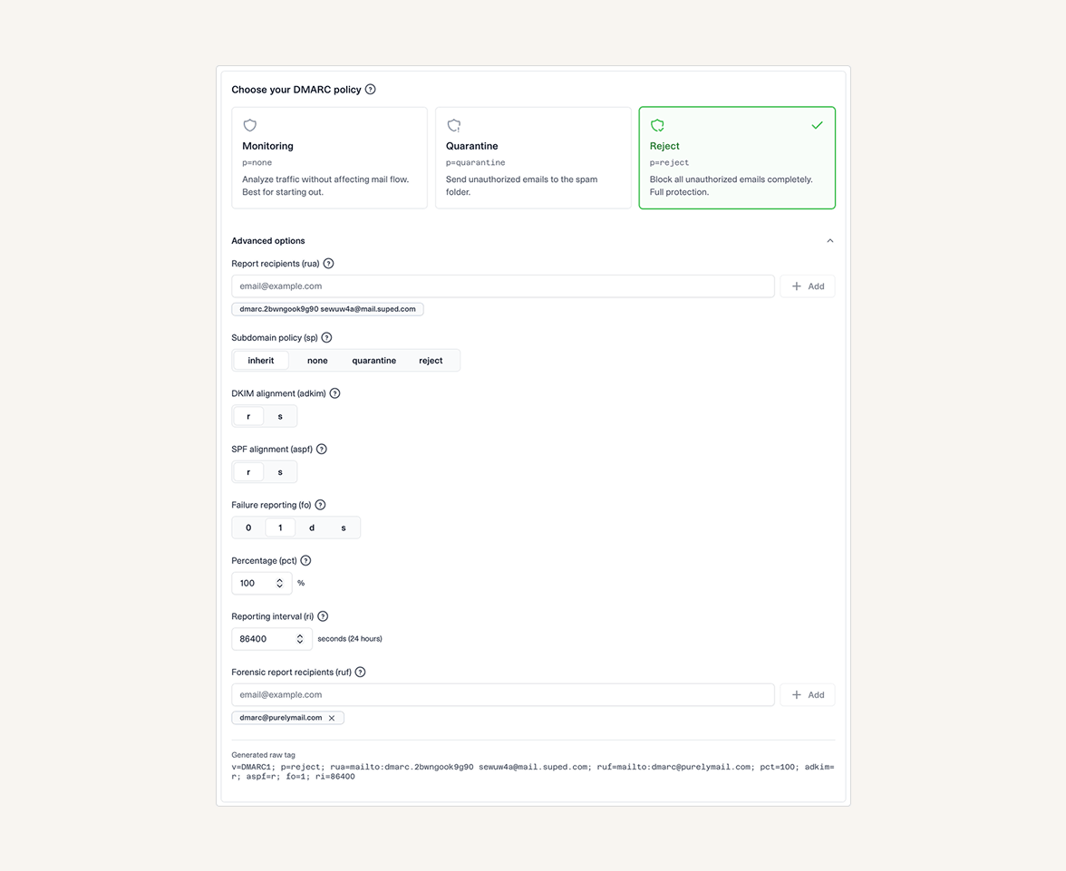 Point your DMARC record at Suped once. After that, every policy change happens right here. Try it below, your edits update the served record live.